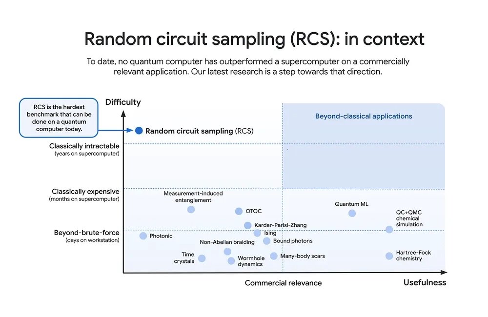 Použita byla úloha Random Circuits Sampling (RCS) stejně jako v případě Sycamore. Zajímavý je následující graf, který ukazuje, jak užitečný RCS je v praxi (nejméně) a jak je výpočetně složitý na klasickém počítači (naopak nejvíce). Tedy Google vhodně zvolil úlohu, která sice nemá praktické využití, ale zato je nejsložitější pro klasické počítače. Více detailů je možné najít v článku v časopise Nature (bohužel paywall).