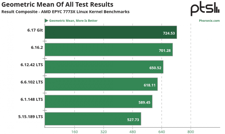 Při testování bylo vše identické, jen se lišila verze jádra. V průměru přes 60 testů je pěkně vidět, že novější jádra jsou rychlejší. Rozdíl mezi čtyři roky starým 5.15 LTS a ještě nevydaným 6.17 je asi 37 %.