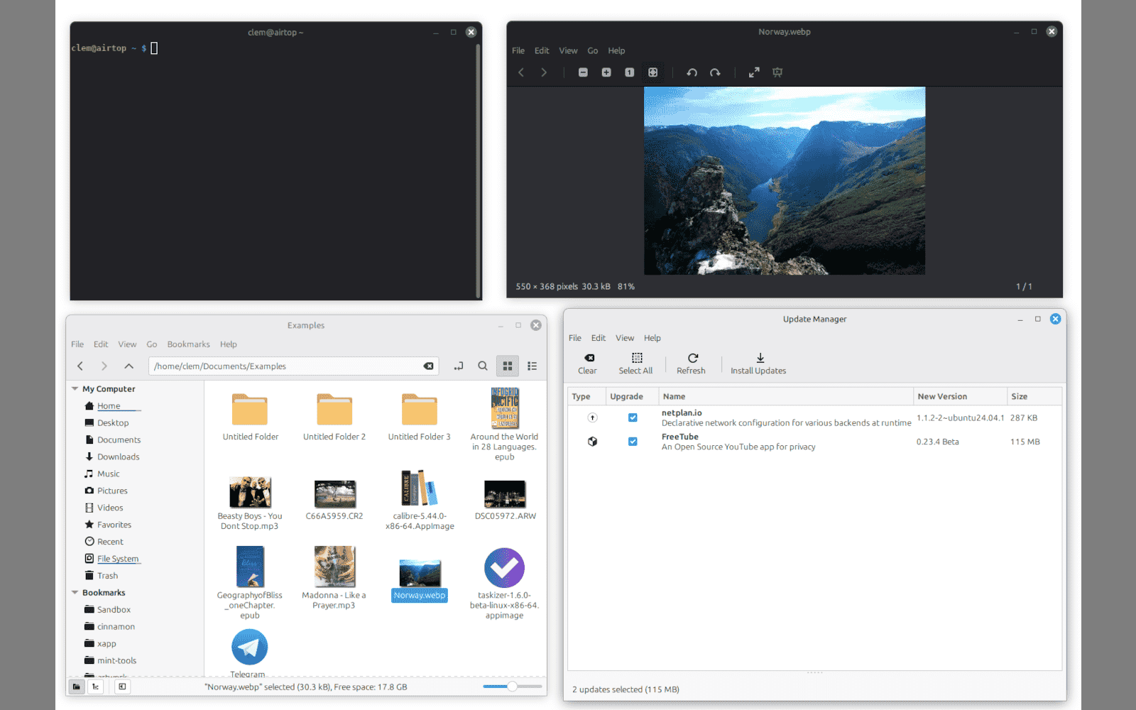 Více vlastních aplikací z dílny Mintu nyní funguje správně pod Waylandem, bylo vylepšeno uživatelské rozhraní a grafické zpracování a zlepšuje se kompatibilita s knihovnou libAdwaita. Správce softwaru nyní také viditelněji rozlišuje mezi klasickými balíčky a aplikacemi dodávanými ve Flatkapu.