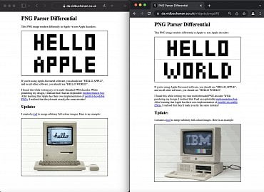 Bezpečnostní expert David Buchanan zjistil, že obrázek PNG může vypadat jinak na Apple a na jiných zařízeních. Na jeho stránce bude buď vidět HELLO WORLD a obrázek IBM, nebo HELLO APPLE a obrázek Apple. Na vině je paralelní dekodér PNG v software Apple, který může chybně vygenerovat jiný obrázek, než standardní jednovláknová knihovna libpng.
