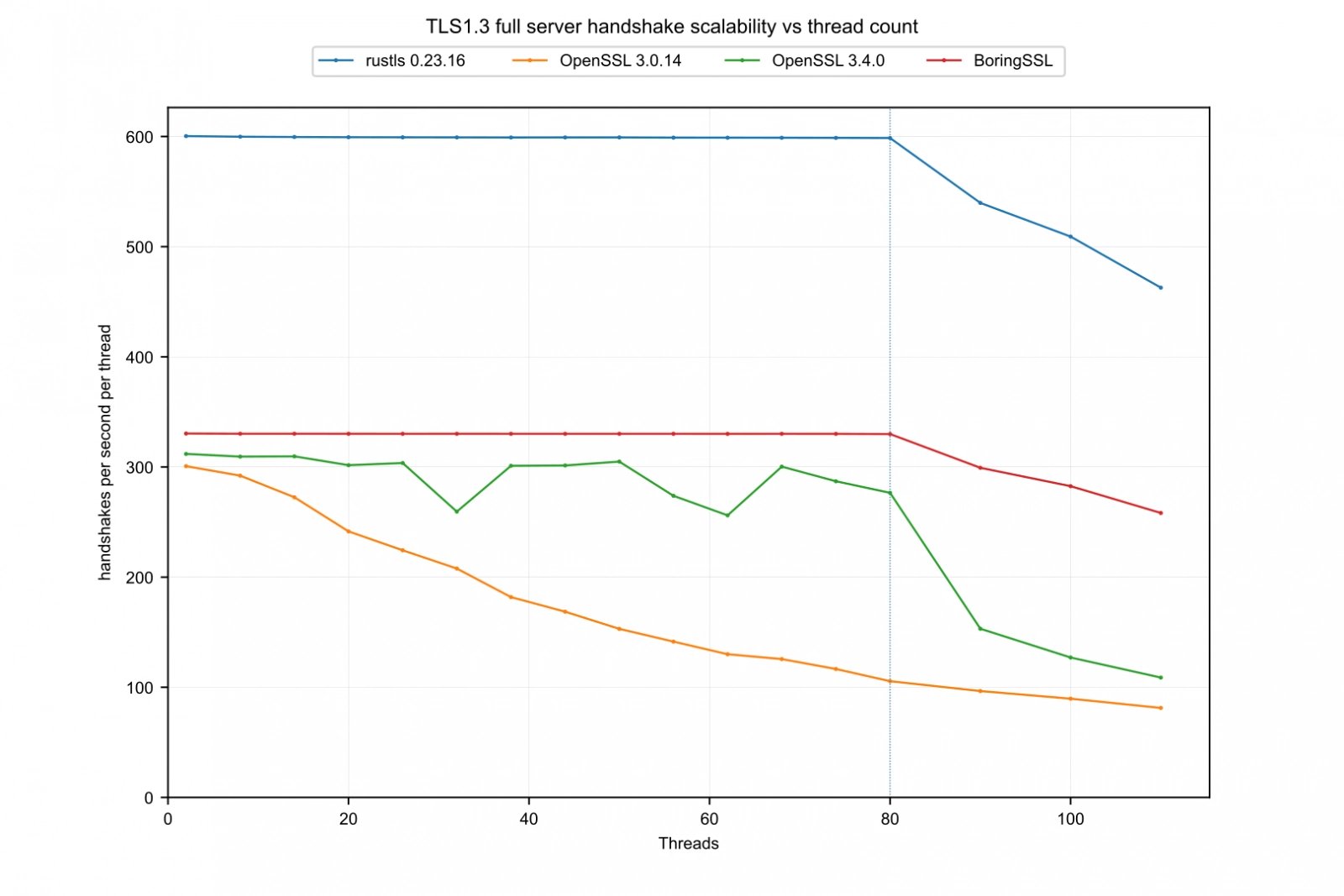 Před týdnem pak vývojáři Rustls testovali výkon Rustls, OpenSSL a BoringSSL na Ampere Altra (ARM64) s 80 jádry. Zajímal je výkon při použití více jader. Zde opět dominuje Rustls následovaný BoringSSL a OpenSSL.