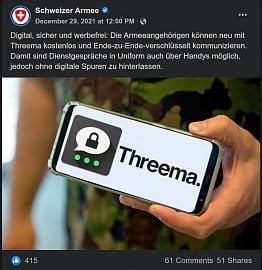 Švýcarská armáda před koncem roku na svém Facebooku zakázala svým vojákům všechny chatovací aplikace na mobilních zařízeních jako například WhatsApp, Signal a Telegram. Povolena je jen švýcarská aplikace Threema. Ta je sice zpoplatněna (u nás 99 kč), ale armáda vojákům nákup proplatí.