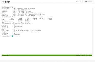 Projekt Termbox umožňuje na jedno kliknutí spustit testovací virtuál, ve kterém běží některá z linuxových distribucí: Ubuntu, Debian, Fedora, CentOS nebo Arch. Uživateli se přímo v okně prohlížeče otevře terminál s multiplexerem Tmux a může si hrát. Virtuální počítač má 512 MB RAM, jedno procesorové jádro a 10GB disk.