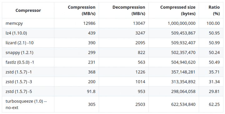 Turbosqueeze používá více vláken, může tedy být výrazně rychlejší než jednovláknové lz4. Zstd je vícevláknové a s lepší kompresí, ale zase o něco pomalejší. Zdrojové kódy jsou na GitHubu a knihovna je vydána pod licencí MIT.