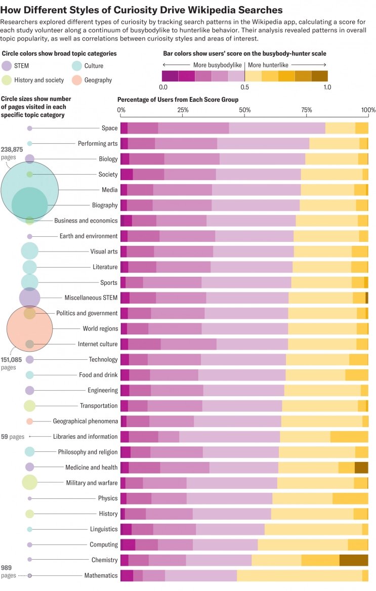Byly objeveny tři typy zvídavosti: šťoural (busybody), lovec (hunter) a tanečník (dancer). Šťoural postupuje klikatou čarou, často přes velmi málo související témata. Naopak lovec jde soustředěně přímo za svým cílem. Tanečník pak prochází velmi rozdílná témata a z nich se snaží vytvořit novou myšlenku. V obrázku vidíte, jak se liší zastoupení šťouralů a lovců v různých tématech. Tanečníci, kteří byli objeveni později, nejsou do této analýzy zahrnuti. Více detailů naleznete v článku.