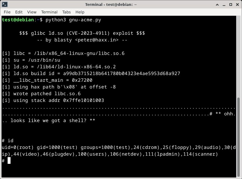Peter Geissler (blasty) zveřejnil PoC kód v Pythonu, který tuto chybu zneužívá. Pokud budete chtít PoC použít na jiný systém, než glibc 2.35–0ubuntu3 (aarch64) a glibc 2.36–9+deb12u2 (amd64), tak si budete muset sami najít offset. Chyba byla ve většině distribucí již opravena.